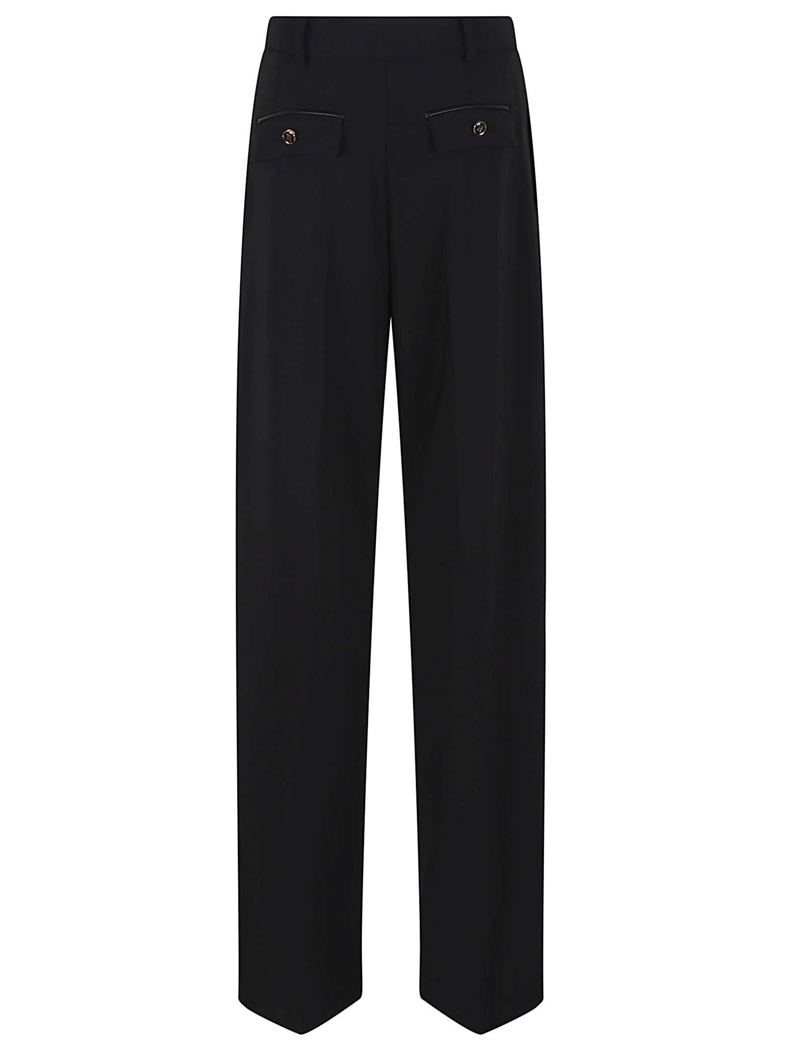 `pantaloni neri con plissettatura frontale, vita alta, gamba dritta, dettagli a dart e zip nascosta`