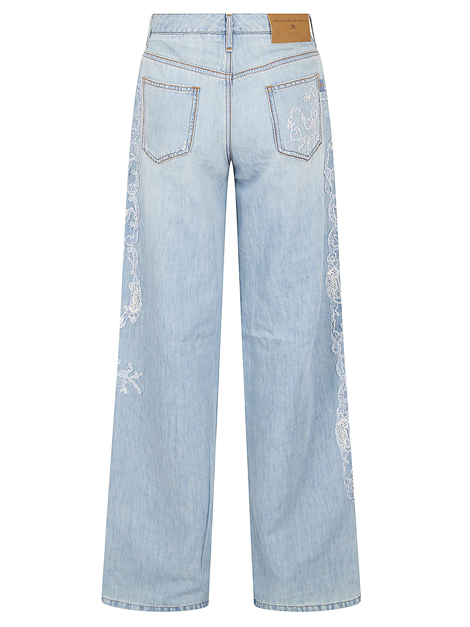 passanti per cintura con ricamo floreale blu, cinque tasche, patch con logo