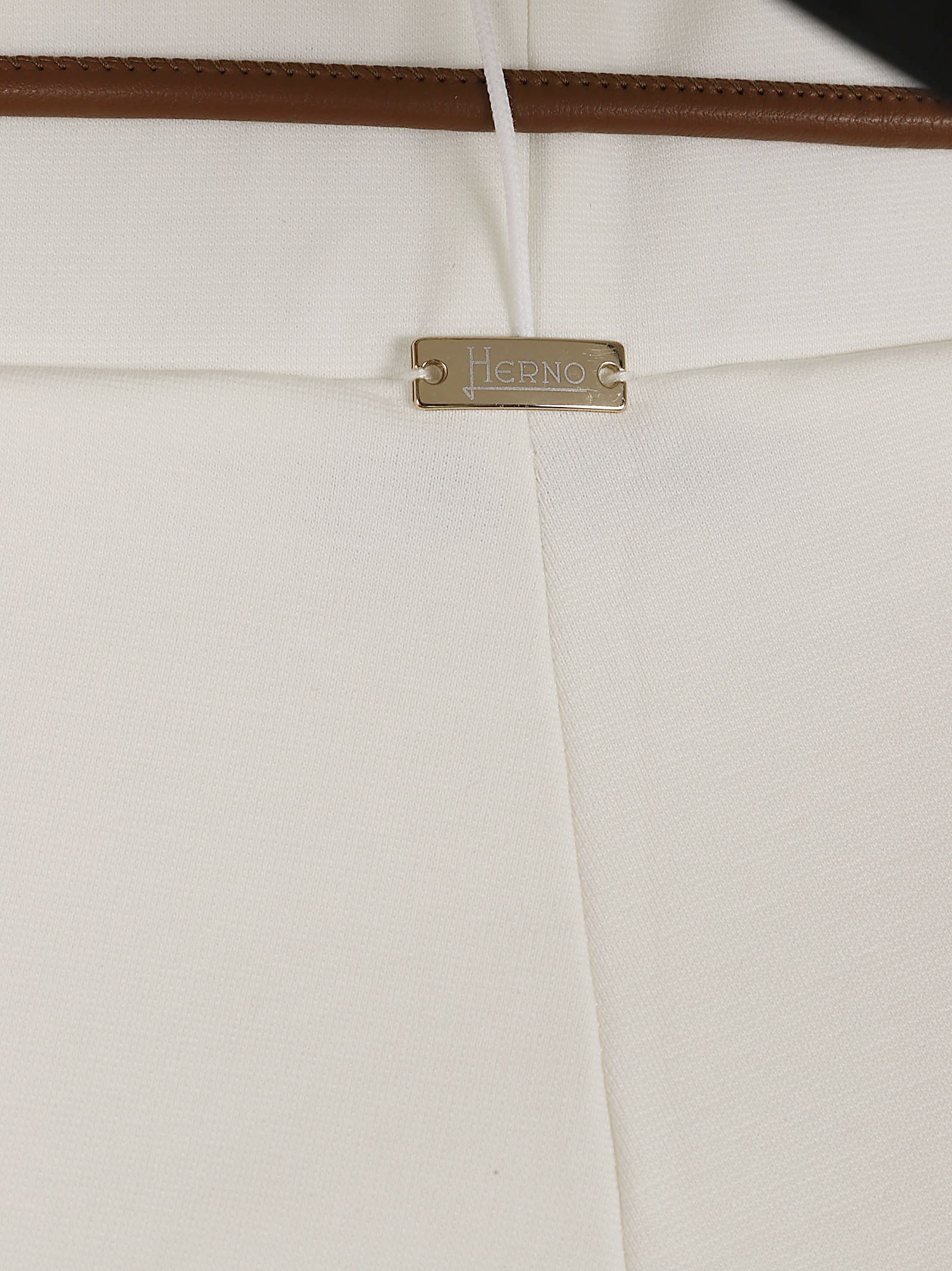 Modello Herno a gamba larga, caratterizzati da una sottile cintura a cordino in cuoio marrone annodata in vita.Il pantalone presenta un taglio fluido che scende dritto dai fianchi, offrendo una vestibilità comoda ma estremamente elegante.L`elemento caratteristico è la sottile cintura a cordino in cuoio marrone. Questo dettaglio aggiunge un tocco artigianale e "nature" al capo, creando un piacevole contrasto cromatico con il tessuto chiaro.Presenta delle pinces frontali appena accennate che aiutano a dare struttura e una caduta perfetta al tessuto, mantenendo comunque un aspetto rilassato.È un capo versatile che cambia carattere a seconda degli accessori:Con una t shirt infilata dentro e dei sandali flat o delle sneaker pulite perun look easy, con una camicia in seta tono su tono e un blazer leggero per un look più ricercato, perfetto per un evento formale o una giornata in ufficio.