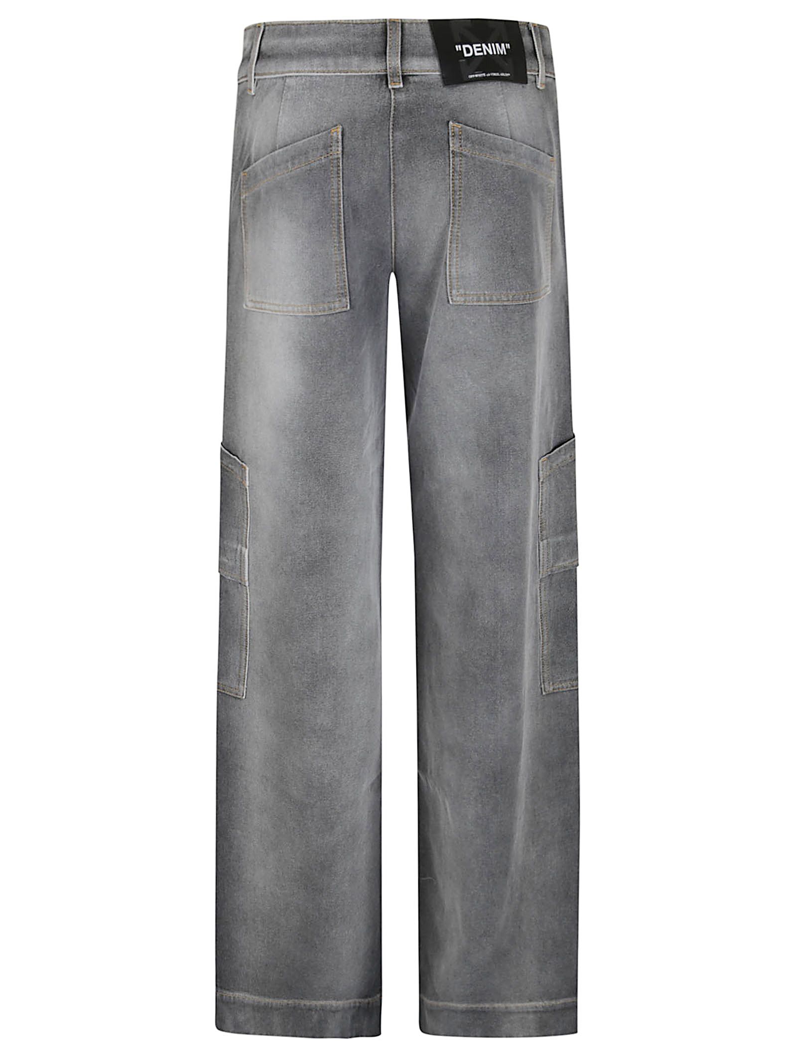 `pantaloni cargo grigi con passanti per cintura, chiusura frontale nascosta, due tasche laterali inserite, due tasche posteriori applicate, denim lavato`