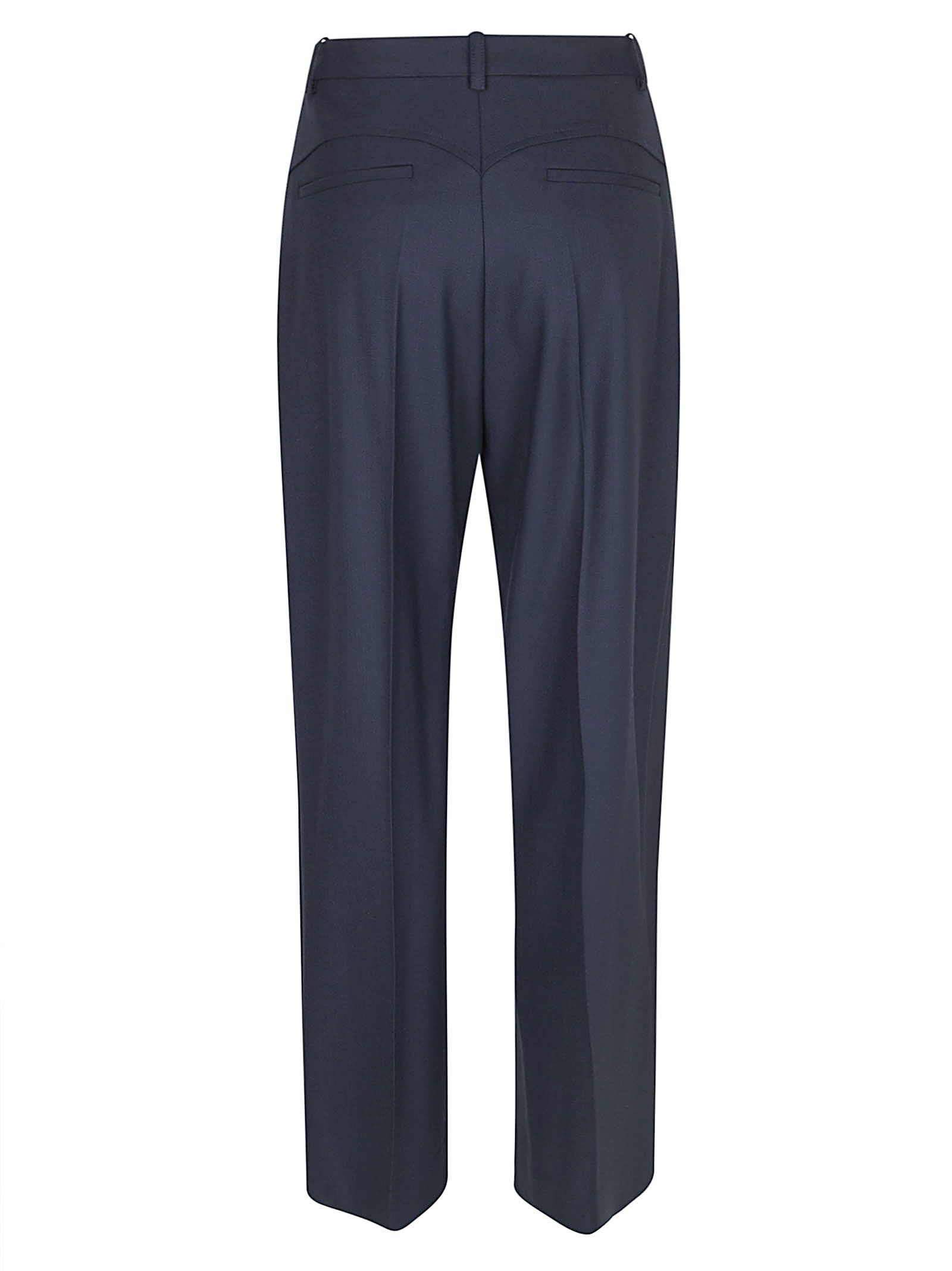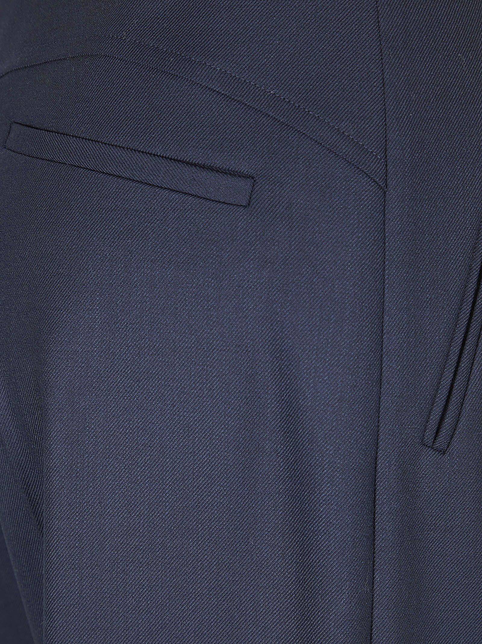 Twill elasticizzato blu mezzanotte con pieghe, vita alta, chiusura frontale nascosta, due tasche laterali a filetto, due tasche posteriori a filetto, passanti per cintura, gamba larga.