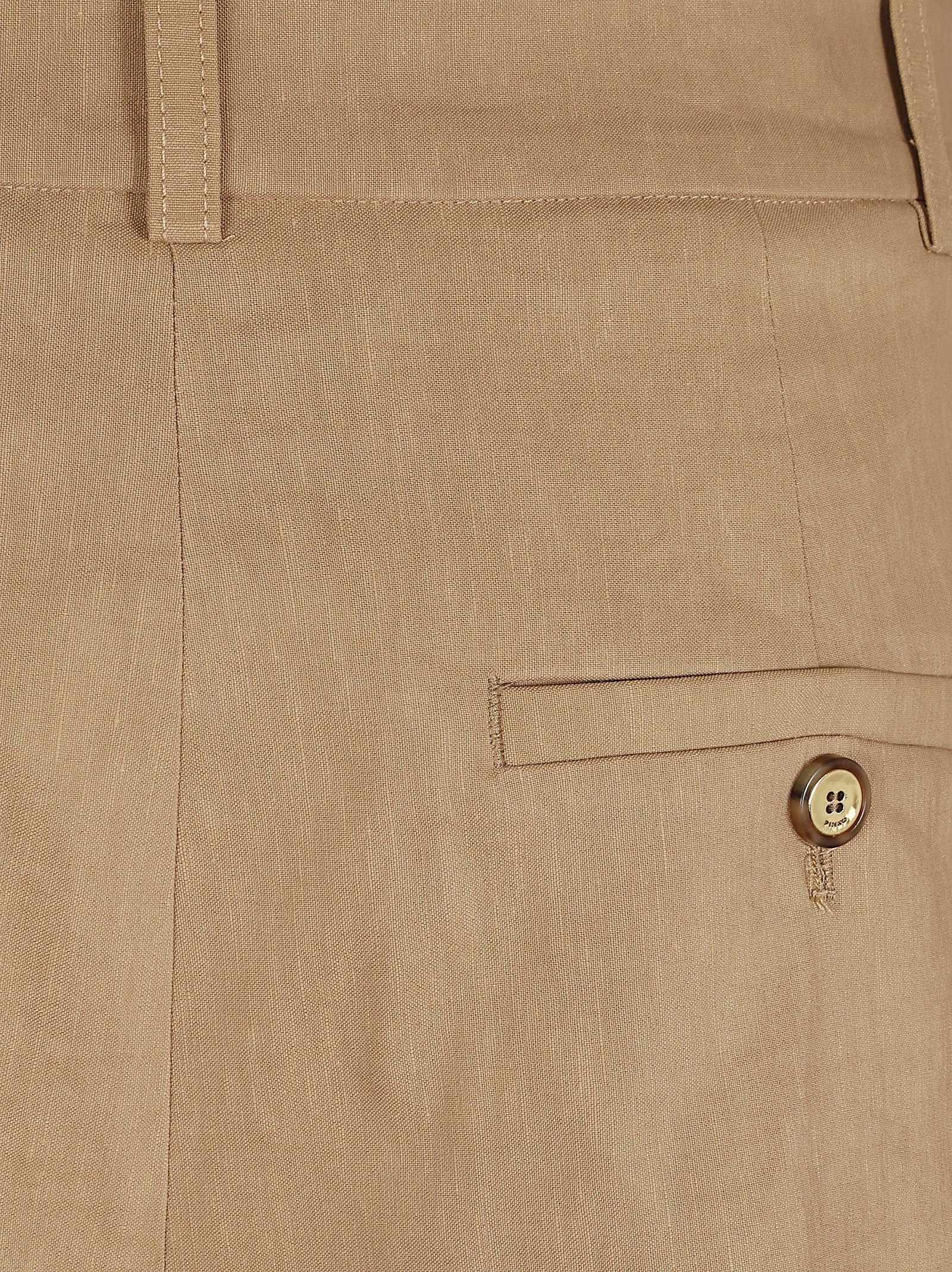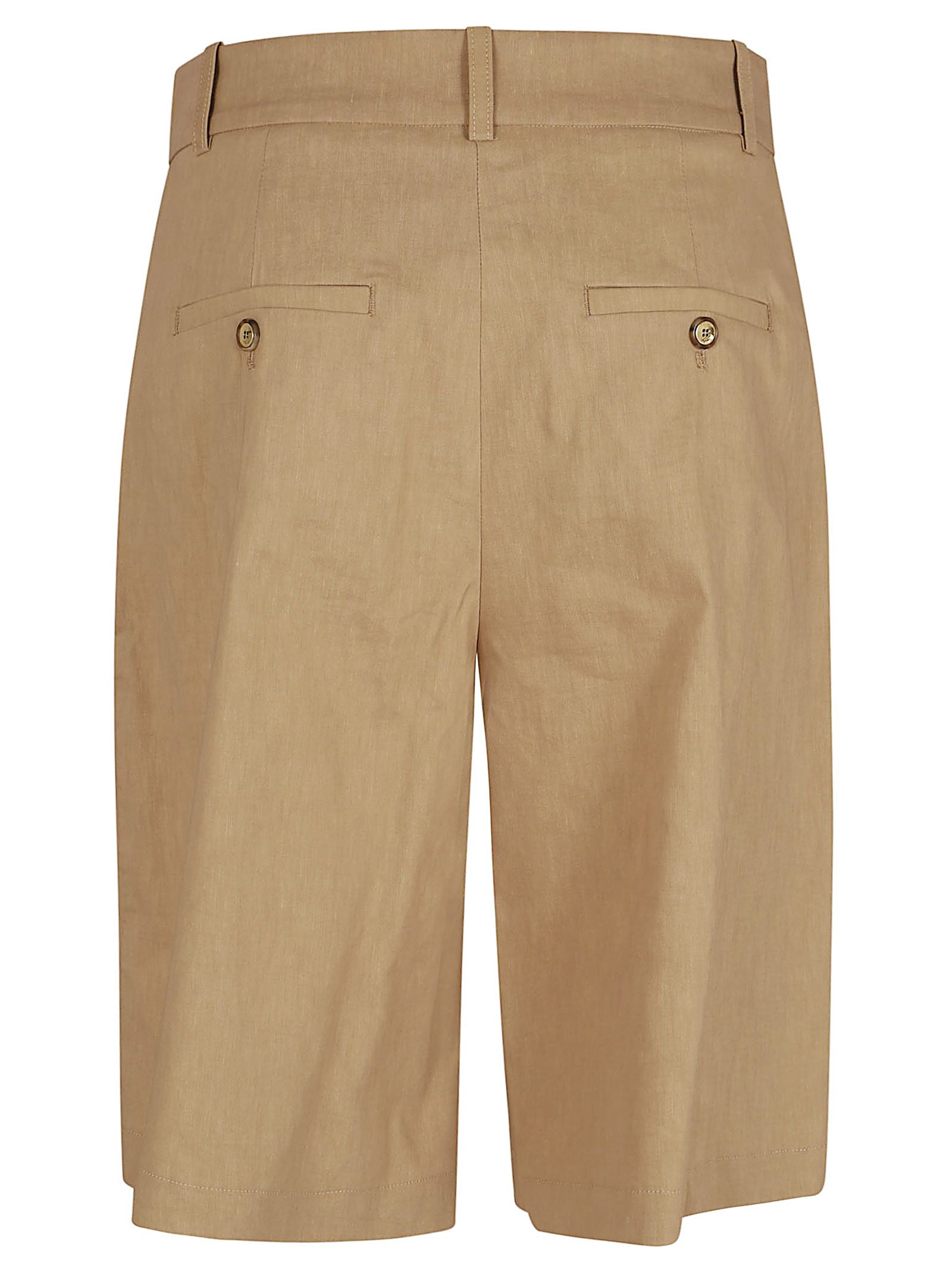 Bermuda realizzato in tessuto fiammato in lino e viscosa elasticizzata.Caratterizzato da una linea ampia con piega centrale e tasche a filetto sul retro con bottone.Chiusura frontale a scomparsa per un look pulito ed essenziale