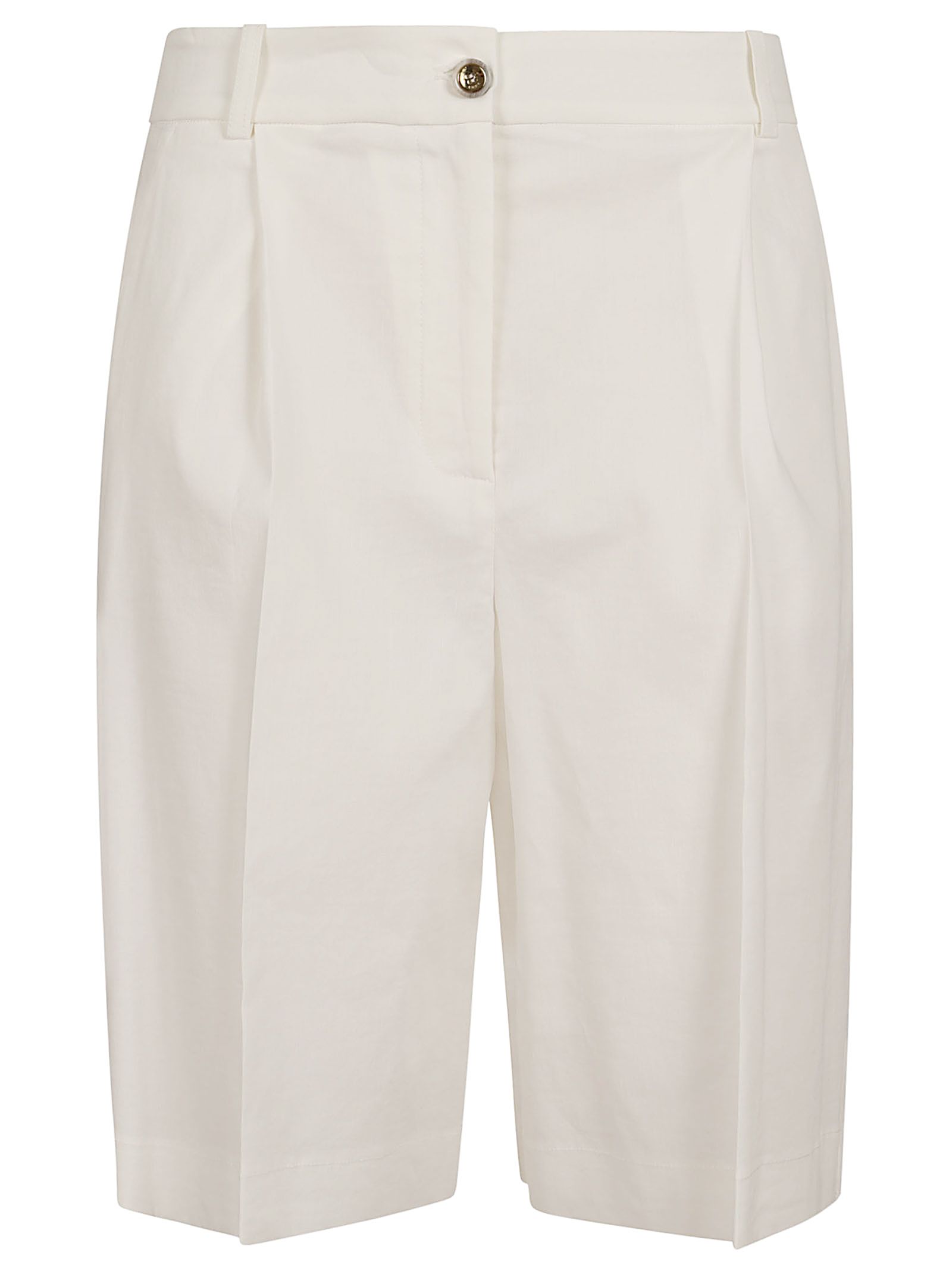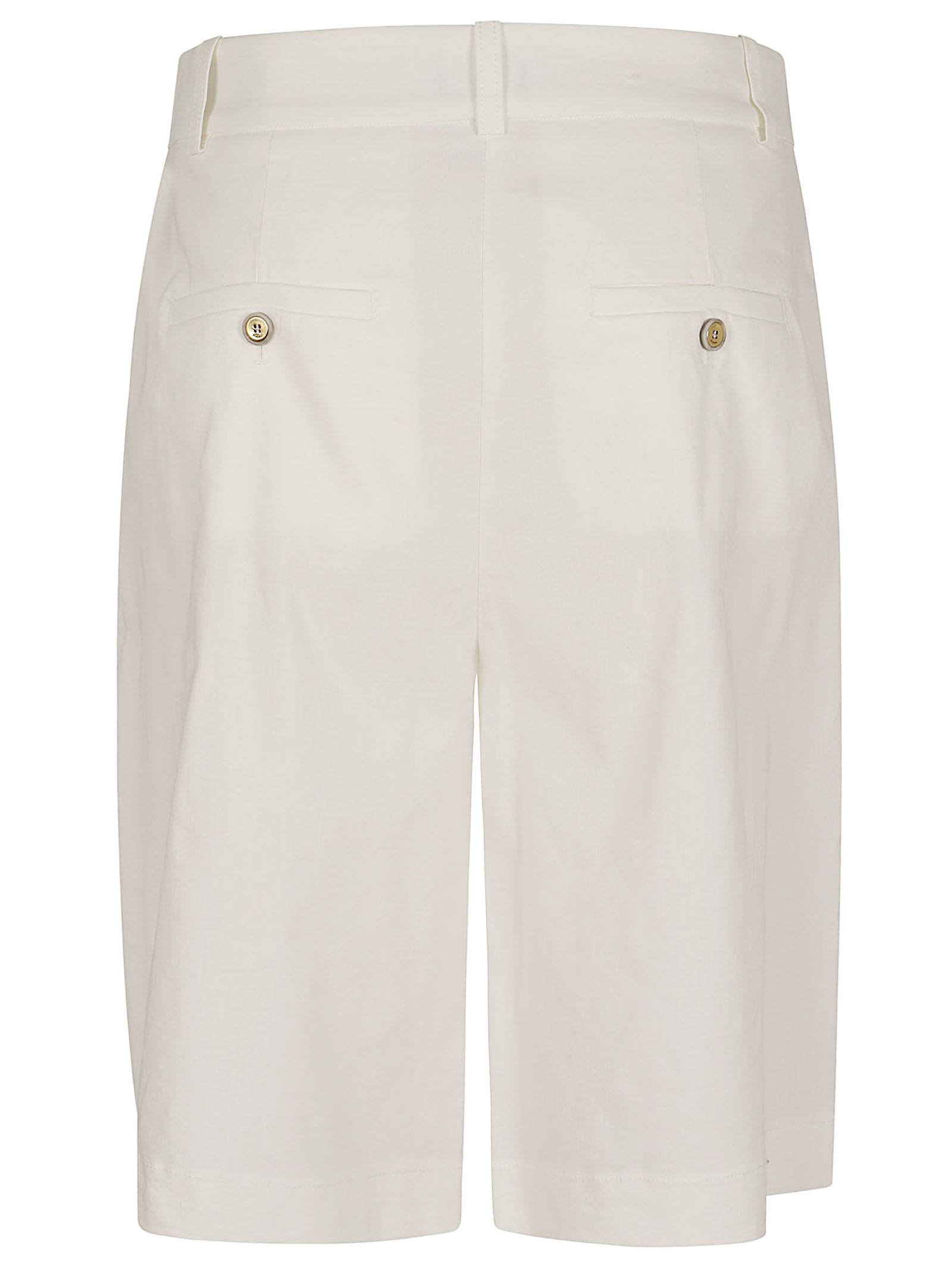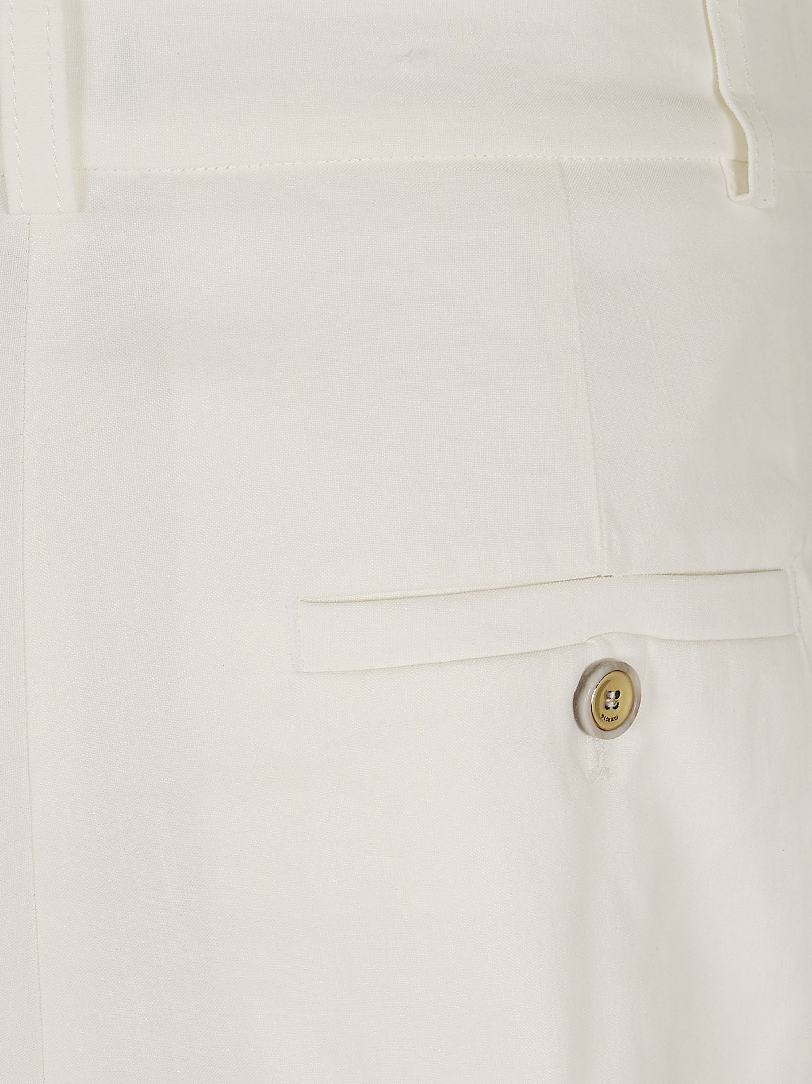 Bermuda realizzato in tessuto fiammato in lino e viscosa elasticizzata.Caratterizzato da una linea ampia con piega centrale e tasche a filetto sul retro con bottone.Chiusura frontale a scomparsa per un look pulito ed essenziale