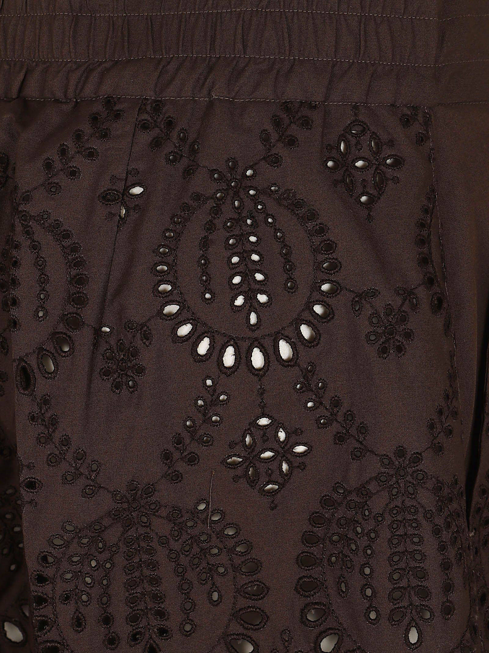 Questi shorts brown con ricami traforati (sangallo) e coulisse in vita presentano un design tipico del brand P.A.R.O.S.H. un mix di eleganza sartoriale e dettagli romantici.Realizzati in un fresco cotone color azzurro polvere, ideale per la stagione estiva.Hanno una silhouette a gamba ampia che ricorda una gonna-pantalone corta, offrendo comfort e freschezza.Presentano una vita alta elasticizzata con effetto arricciato. La coulisse in tinta permette di regolare la vestibilità e aggiunge un tocco casual al design ricercato.