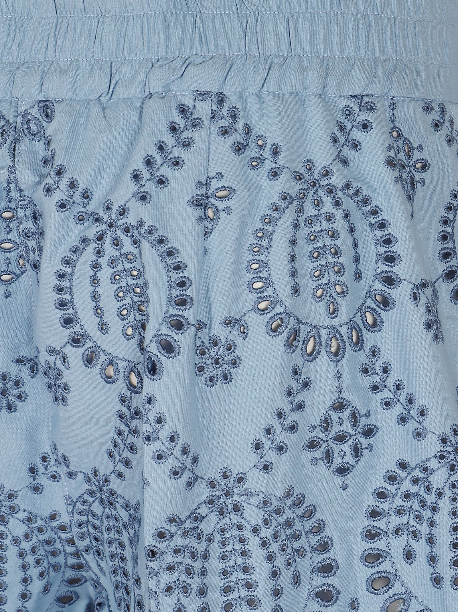 Questi shorts azzurri con ricami traforati (sangallo) e coulisse in vita presentano un design tipico del brand P.A.R.O.S.H. un mix di eleganza sartoriale e dettagli romantici.Realizzati in un fresco cotone color azzurro polvere, ideale per la stagione estiva.Hanno una silhouette a gamba ampia che ricorda una gonna-pantalone corta, offrendo comfort e freschezza.Presentano una vita alta elasticizzata con effetto arricciato. La coulisse in tinta permette di regolare la vestibilità e aggiunge un tocco casual al design ricercato.