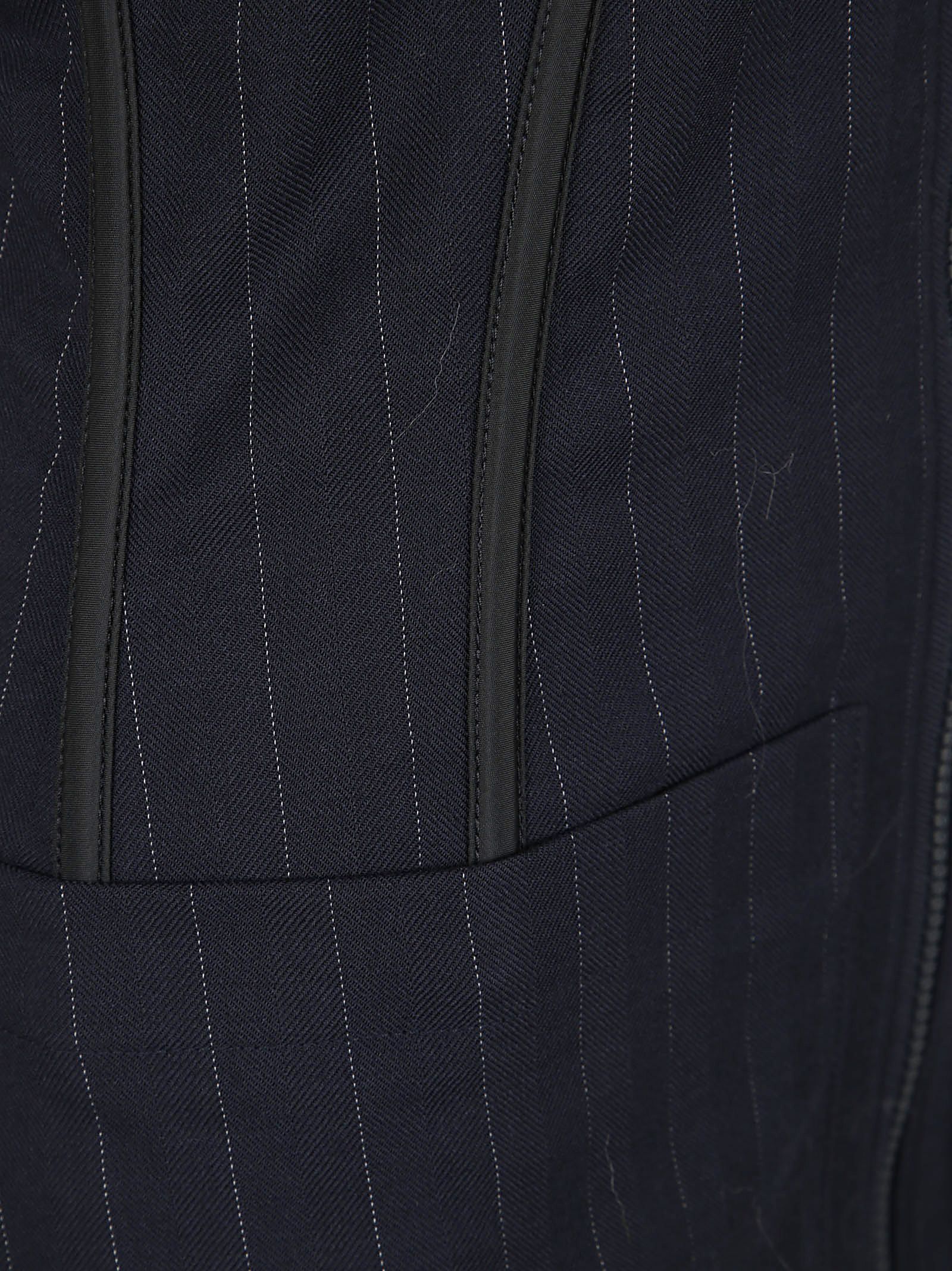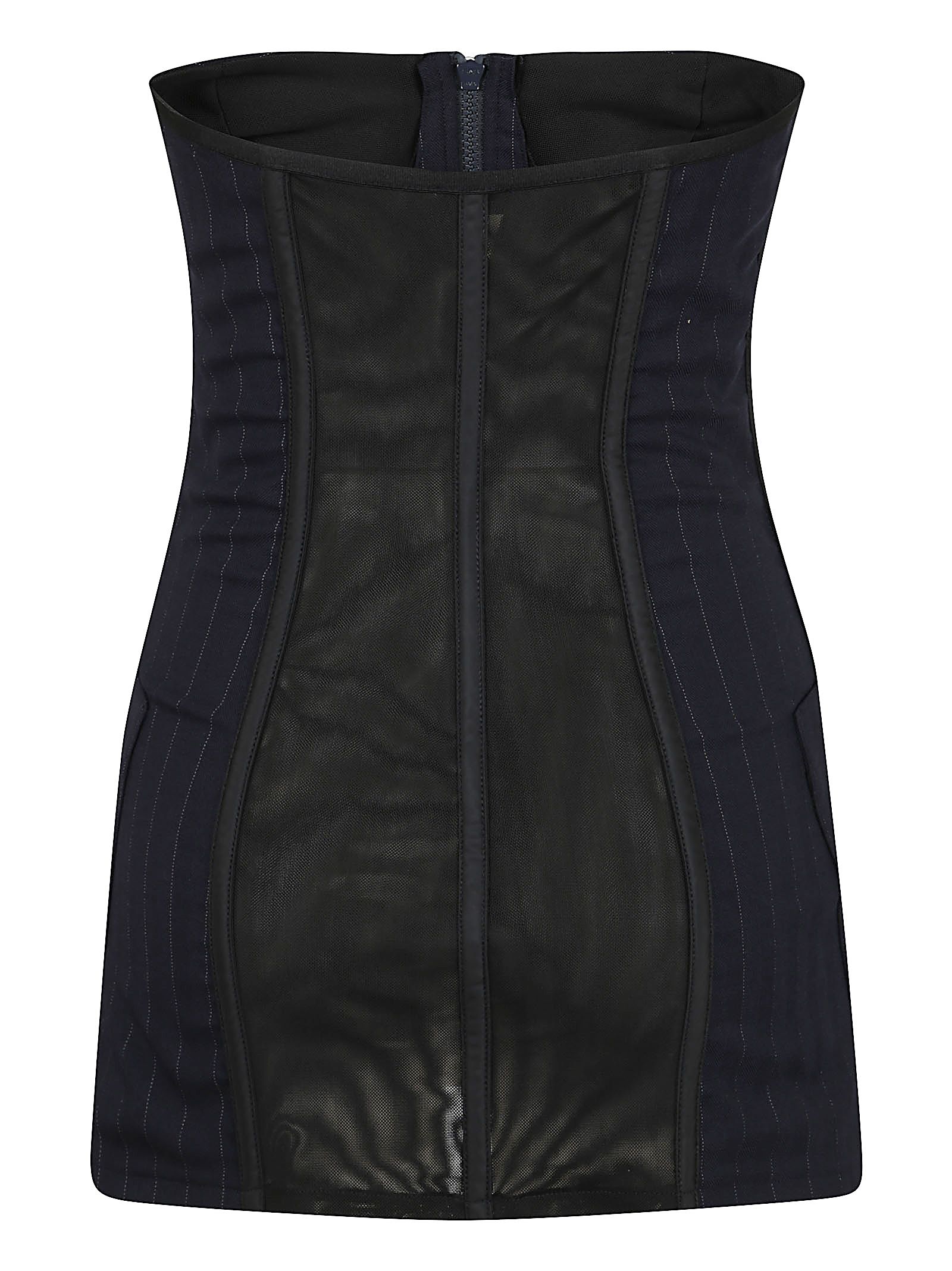 Top in lana poly gessato di PINKO.Scollo leggermente a cuore; coppe preformate; chiusura con zip doppio cursore frontale. Design strutturato, ispirato ad un capo vintage interamente sostenuto da stecche esterne che creano linee grafiche a contrasto con il tessuto gessato foderato con tela busto elastica.