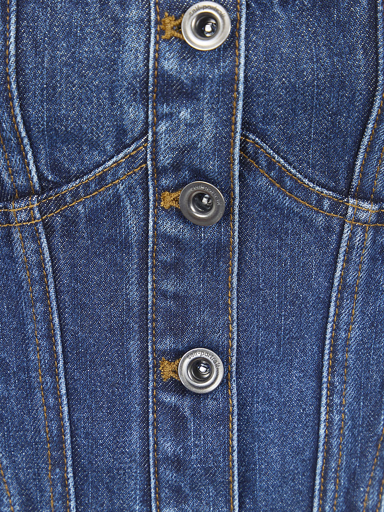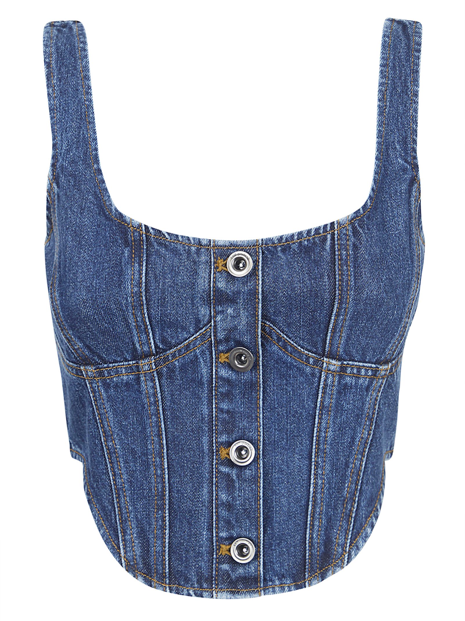 Top corsetto in denim di SELF-PORTRAIT.Chiusura con cerniera a vista sul retro; corsetto interno; design vestibilità aderente, che segue le forme del corpo. Caratterizzato da orlo curvo e cuciture a contrasto che scolpiscono il corpetto.